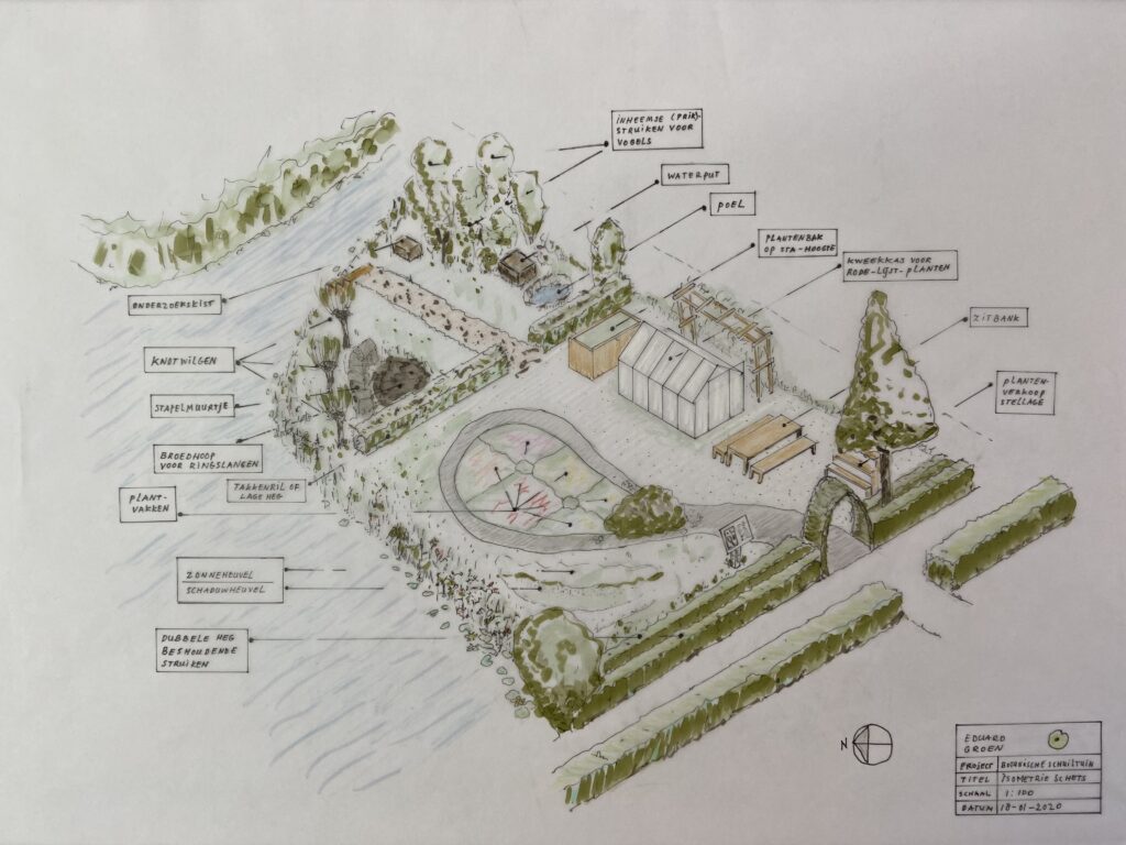 Deze isometrische schets, die ik maakte op 18 januari 2020, geeft een ruimtelijk overzicht van de botanische schuiltuin van Oostvliet.